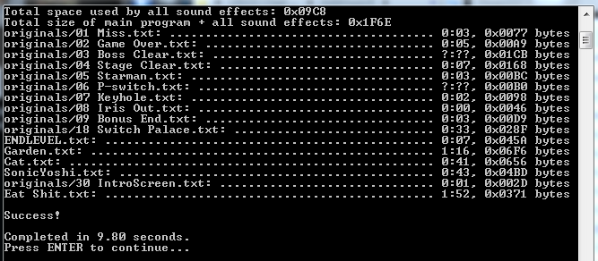Quando tudo estiver pronto basta clicar em Run para injetar as músicas novas em sua ROMhack. Se tudo der certo uma nova janela irá abrir dizendo que foi um sucesso e a lista das faixas inseridas.